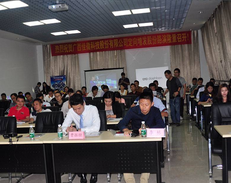2015年11月21日,广西尊龙时凯科技股份有限公司首场定向增发股份路演活动在广西南宁隆重举行。。。此次路演在大家的支持下,,,不少企业家在路演现场就签下了认购协议,,,本场增发已完成预定目标,,同时路演活动现场还分别展示了公司所有自主研发的微投产品,,其中包括最新型海微H3000智能便携掌上微投,,,内置安卓系统,,轻巧时尚的机身、、强大的娱乐功能在办公等多种应用场景下,,,,多屏互动、、自由切换,,既便捷又智能,,,,受到各位嘉宾的青睐与喜爱。。。。